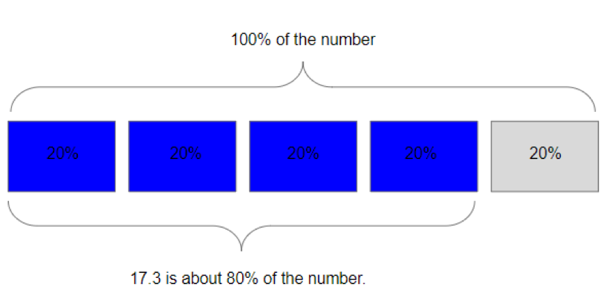 If four blocks of 20% put together is 17.3, then I can divide 17.3 by four to find the size of one block of 20%. 17.3 divided by four is close to 4. So 20% (one block) of the number I’m trying to figure out is close to 4.