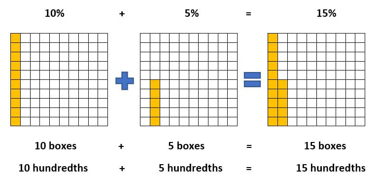 Now you have the tools you need to build any percent you want! Benchmark percents can be put together to build more percents. For example, to build 15% of a number, you can add together 10% and 5% of the number. Here’s a picture to show that this works: