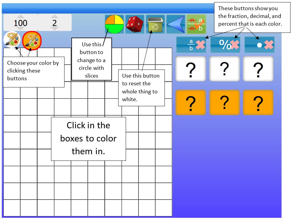Want to play more with what fractions, decimals, and percents look like? Go back to: www.visnos.com/demos/percentage-fraction-decimals-grid and play around. Try out some of the buttons you haven’t played with before!