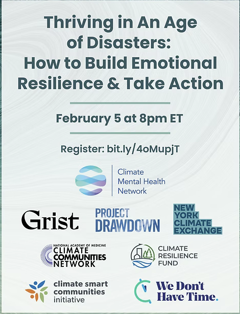 They are offering a free webinar Feb 5th at 8pm ET, “Thriving in an Age of Disasters: How to build emotional resilience and take action.”
